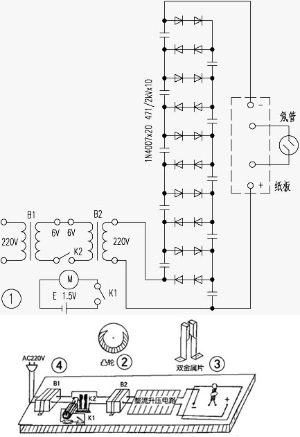电路见图1。图中B1为220V输入、6V输出,B2为6V输入、220V输出的变压器,它们组成1∶1隔离变压器形式。K2为断续器,由带凸轮的电动机和两金属片组成。当合上开关K1时,电动机转动,带动凸轮周期性地挤压K2的金属片,使两触点周期性地接触与断开。在断开的瞬间B2次级输出很高的感应电压,再经10倍压整流为几万伏直流高压,用以模拟跨步电压触电。