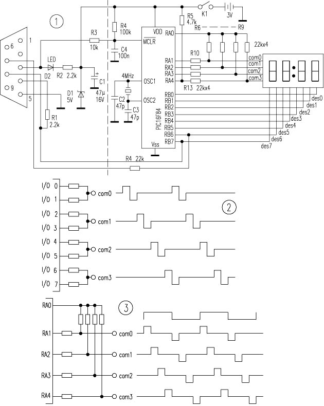 1. LCD液晶显示器的工作原理。 常见的LCD驱动原理如图2。要在一个com上输出三种电平,即Vcc、1/2Vcc、0,需要2个I/O口,如果有四个com,就需要占用8个I/O口,一个八段数字符需要2个I/O口,这样PIC16F84的13个I/O口只能显示2位半数字。本文采用图3所示的驱动方法,四个com只需5个I/O口即A口,因RA4为开集输出,故需接一集电极电阻,剩下的8个I/O口即B口可显示4位数字字符。