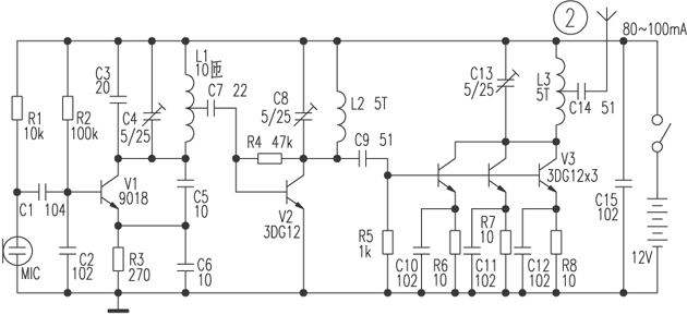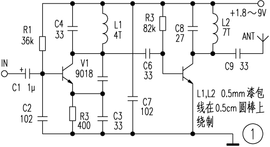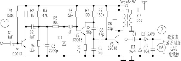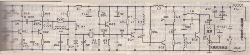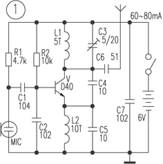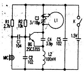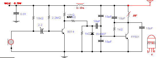别看这个电路简单,它在开阔地带能发射一公里呢。优点是简单,变容管调制稳定。由于不是频合,只是业余用。501可以用D-40代替。
