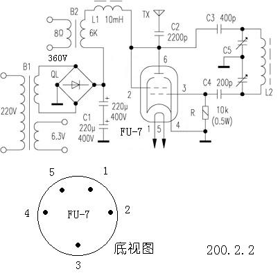 L1选用∮0.22mm的漆包线在MX-2000的磁环上绕100匝。L2决定电台的发射频率。如果频率选在中波波段时,L2可选用∮0.35mm的漆包线在中波磁棒上绕70匝,或选用∮0.12mm的漆包线在∮25mm的纸筒上密绕90匝。这样发射频率会落在550-1650KHz之间。如果选用短波波段时,L2可用∮0.5mm的漆包线在∮16mm的纸筒上间绕9匝。这样构成的振荡器频率就落在6~18MHz之间。C5为空气双联,其容量为360PX2。B1为原机电源变压器。高压部分整流用4只1N5408。C2 C3 C4为耐压600V的云母电容,R可选用水泥电阻。因耗散功率较大,其功率选≥1W。TX为λ/4天线,可用一段粗导线代替,长度约为发射波长的1/4。