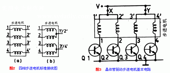 在实际应用中,最流行的还是混和型的步进电机。但工作原理与图1所示的可变磁阻型同步电机相同。但结构上稍有不同。例如它的转子嵌有永磁铁。激励磁通平行于X轴。一般来说,这类电机具有四相绕组,有八个独立的引线终端,如图2a所示。或者接成两个三端形式,如图2b所示。每相用双极性晶体管驱动,并且连接的极性要正确。