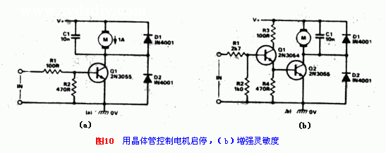 现在比较流行的方法,是用开关晶体管来代替机械开关,无触点、无火花干扰,速度快。电路如图10(a)所示。当输入端为低电平时,开关晶体管Q1截止,电机无电流而处于停止状态。如果输入端为高电平时,Q1饱和导通,电机中有电流,因此电机起动运转。图中二极管D1和D2是保护二极管,防止反电动势损坏晶体管。电容C1是消除射频干扰而外加的。R1基极限流电阻,限制Q1的基极电流。在6V电源时,基极电流不超过52mA。在这种情况下,Q1提供电机的最大电流为1A左右。