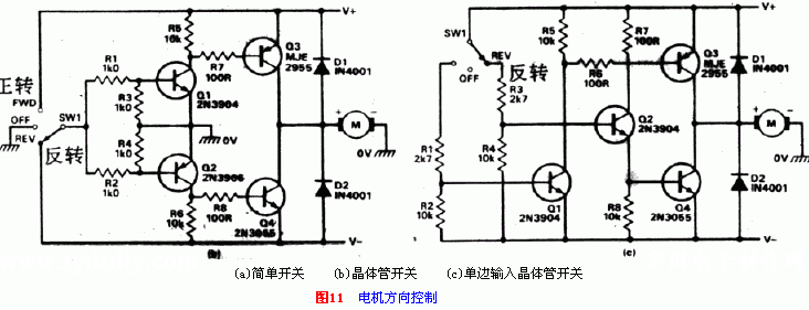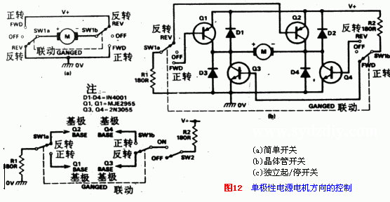 如果电源为单极性,那么控制方向的开关就要双刀三掷。如图12(a)所示。不过用晶体管连接为桥式电路,也是最基本和最通用的形式。电路如图12(b)所示。