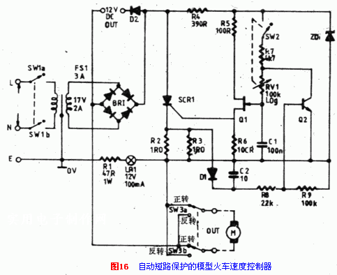 图16所示的电路是具有自动短路保护的模型火车速度控制器。电源用12V,最大输出电流为1.5A。如果轨道上出现短路时,控制单元上张有短路探测器和保护电路,自动将输出电流限制在100mA(有效值)