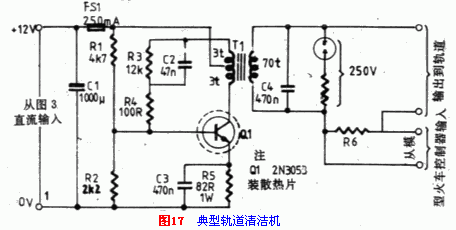 图17是典型的铁路轨道清洁机的电路原理图。电源部份与图16的整流部份相同。有了自动轨道清洁机,就可以保持模型火车与轨道之间有良好的电接触。因为车轮与轨道之间,容易被脏物或氧化造成接触障碍。这个问题的解决是经过一个高频高压小功率的信号发生器,把控制信号送至轨道,如果道轨上存在污物或氧化的危害时,将使其信号中断,高压发生器便工作。结合图17叙述其工作原理。