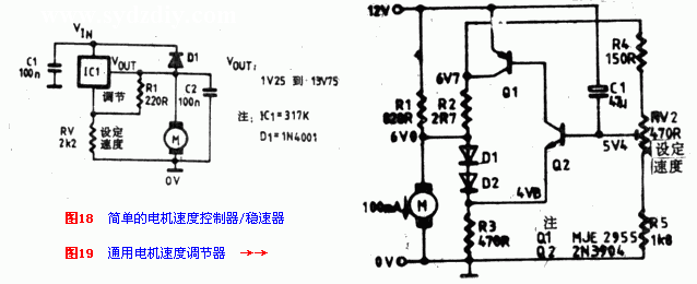 电机速度稳定器,意味着控制电路的电压和电机的负载尽管在很大的范围内变化,电机的转速也能稳定不变。图18是一种简便的电机速度控制器和稳速电路。这个电路的特点是:不管电压和温度怎样变,加在电机上的电压都恒定不变,所以速度稳定。