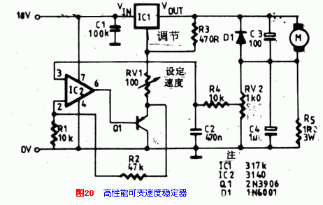 高性能可变速度稳定器电路如图20所示。它可用作宽范围速度可变的场合,例如12V微型电钻。
