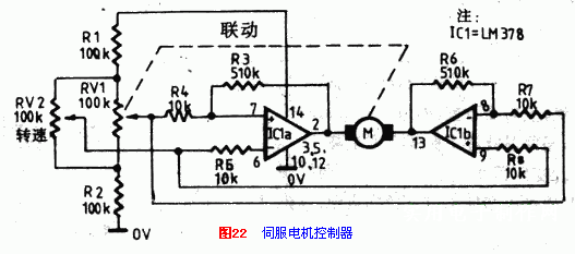 图22示出了伺服电机的最简单的应用。电位器RV1由伺服电机带动。电机可选用电流不超过700mA,电压为12~24V的任一种伺服电机。图中RV1和RV2是接成惠斯登(Wheatstone)电桥。集成电路LM378是双路4瓦功率放大器,也以桥接方式构成电机驱动差分放大器。