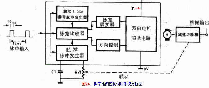每一个输入脉冲分三路同时传送。一路触发1.5ms脉宽的固定脉冲发生器。一路输入触发脉冲发生器,第三路送入脉宽比较电路。用齿轮盒输出至RV1,控制可变宽度的脉冲发生器。这三种脉冲同时送到脉宽比较器后,一路确定电机驱动电路的方向。另一路送给脉宽扩展器,以控制伺服电机的速度,使得RV1迅速驱动机械位置输出跟随输入脉宽的任何变化。