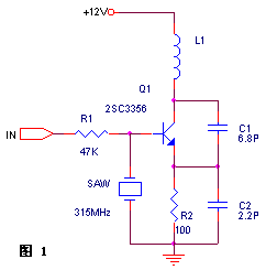 早期的发射机较多使用LC振荡器,频率漂移较为严重。声表器件的出现解决了这一问题,其频率稳定性与晶振大体相同,而其基频可达几百兆甚至上千兆赫兹。无需倍频,与晶振相比电路极其简单。以下两个电路为常见的发射机电路,由于使用了声表器件,电路工作非常稳定,即使手抓天线、声表或电路其他部位,发射频率均不会漂移。和图一相比,图二的发射功率更大一些。可达200米以上。