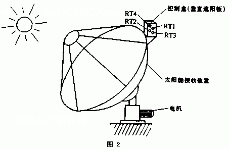 整个太阳能接收装置的结构如图2。兼作垂直遮阳板的外壳最好使用无反射的深颜色材料,四只光敏电阻的参数要求一致,即亮、暗电阻相等且成线性变化。安装时,四只光敏电阻不要凸出外壳的表面,最好凹进一点,以免散射阳光的干扰;垂直遮阳板(即控制盒)装在接收装置的边缘,既能随之转动又不受其反射光的强烈照射。凋试时,首先不让太阳直接照到四只光敏电阻上,然后调节RP1、RI2,使LM358两正向输人端的电位相等且高于反向输人端0.5V-1V。调试完毕后,让阳光照到垂直遮阳板上,接收装置即可自动跟踪太阳了。