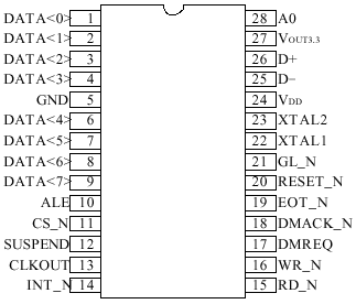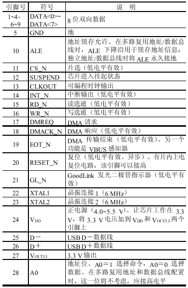 PDIUSBD12引脚如 图 2 所示,引脚如 表 1 所列。