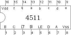 4511应用特点:具有灯测试,消隐和锁存控制功能。能提供较大的拉电流。可直接驱动LED显示器。