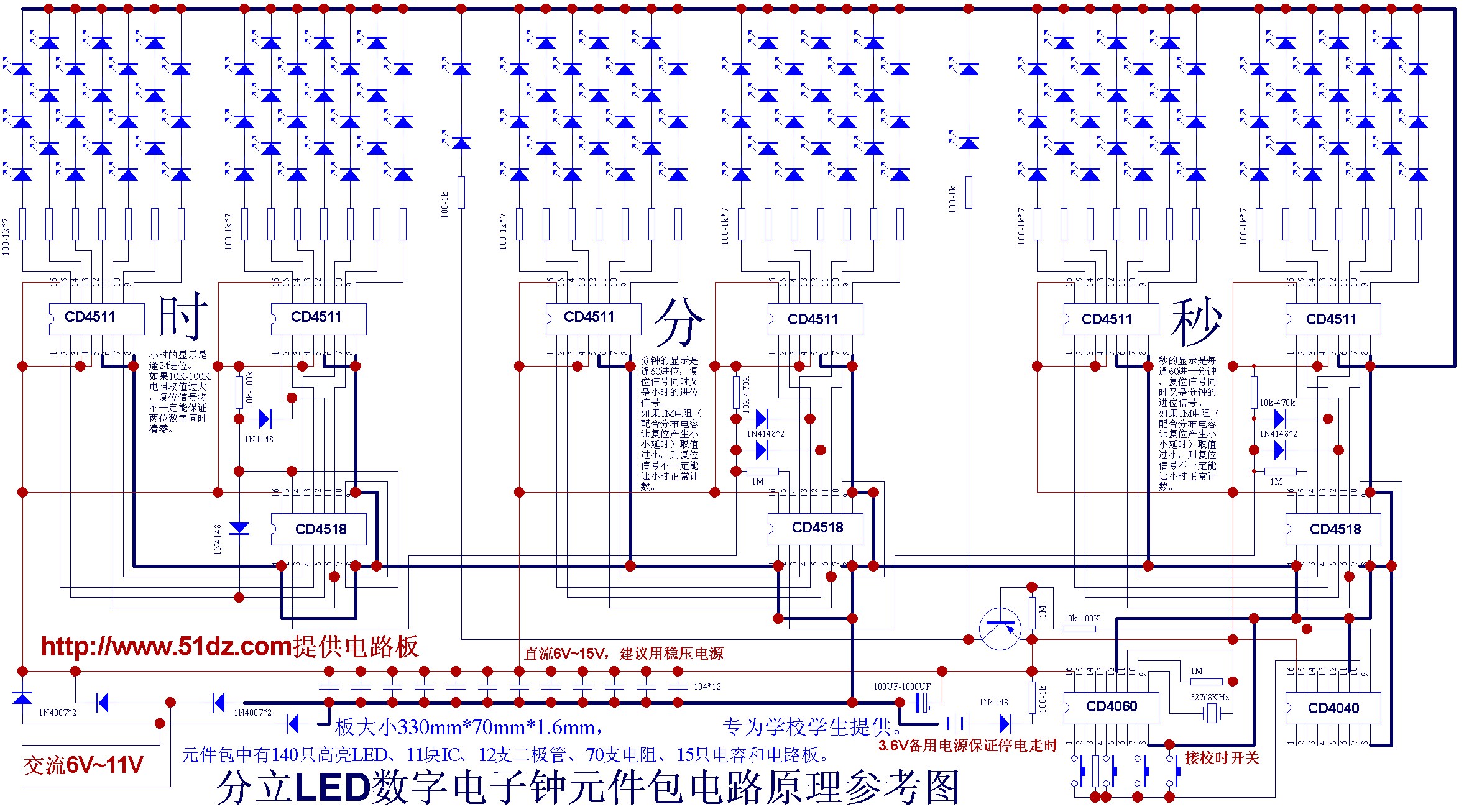 本套件主要元件有11个数字集成电路(CD4543 6个;CD4518 3个; CD4040 1个;CD4060 1个)、130个高亮发光二极管和52个电阻及其它所有元件用胶袋包成一包,配上电路板,会员价38.00元,欢迎各位电子爱好者一起动手制作。 套件内含有电路原理图等装配资料,电路板上也是元件装配图,适合学生、电子初学者、成人等学习、娱乐、装配用途。