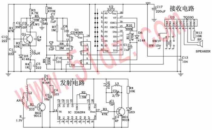 制作和调试 元件焊接前经万用表测量,元件焊接位置应准确无误,注意有极性的元件和外形相似的元件。 用万用表笔把U1(4069)⑥和⑦脚短路,或者U2(2272)⒄和⒅脚短路,喇叭都可奏响优美的音乐。拉开发射器和接收器的距离,用无感笔微调发射器上的C2(2/7P)使门铃发声,细调C2使遥控距离最远,调整C2时应一点一点进行,调好不再转动以免损坏元件。 调试前U2(2272)和IC(2262)①—⑧脚应悬空。为使产品之间不互相干扰,调试后的产品应自行编码,注意U2和IC的①—⑧脚的编码应完全一致(接正电源或地或悬空应相对应),如IC②脚接正电源,U2②脚也应接正电源;IC②脚接地,U2②脚也应接地;IC②脚接悬空,U2②脚也应接悬空;依此类推。